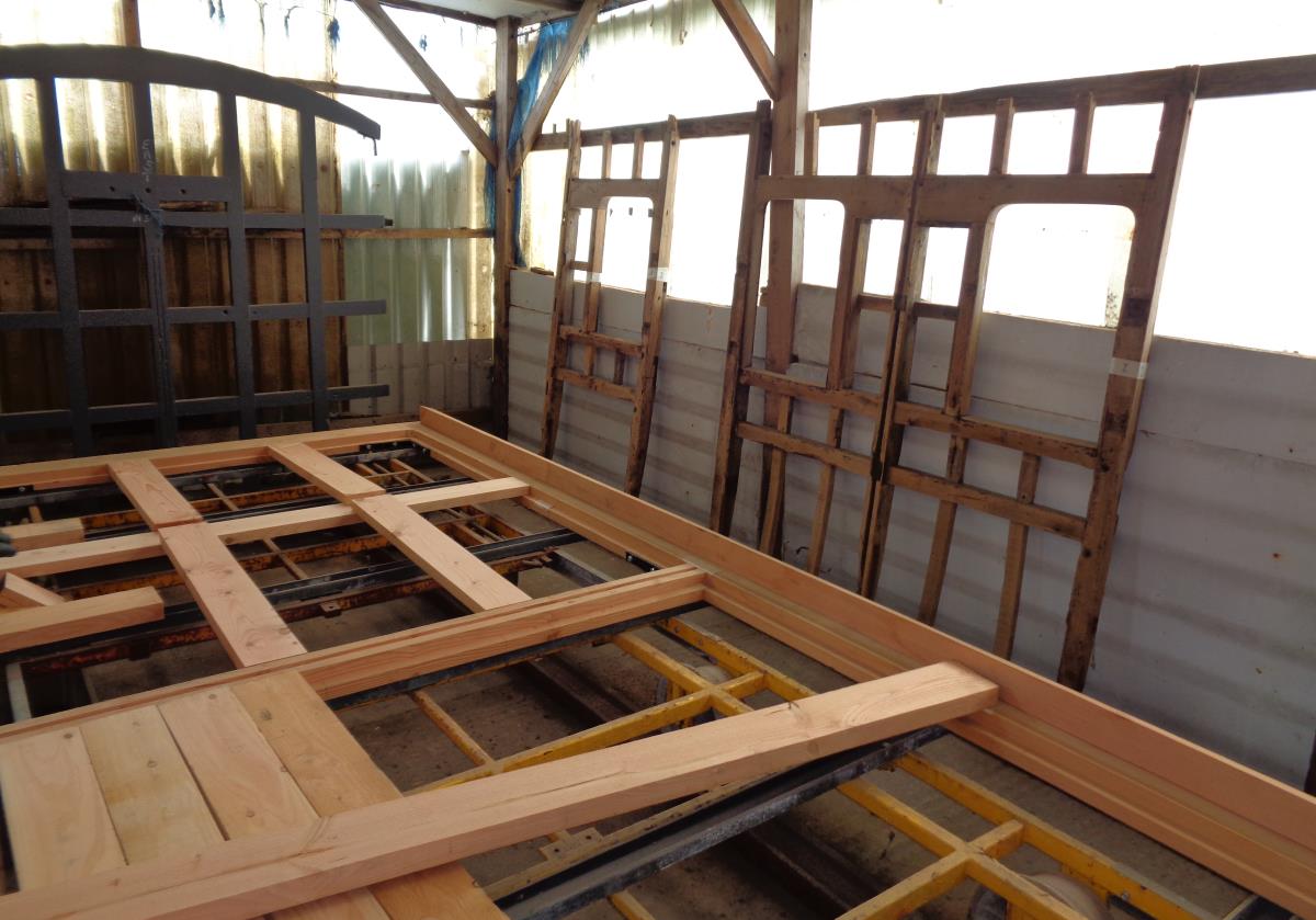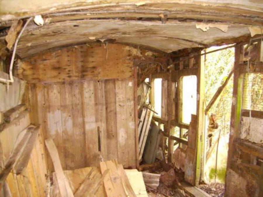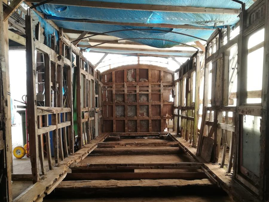 The framework could be seen through the panels that had disintegrated. It was in excellent condition including the beams at floor level. The eight doors were still there and most had the original glass still in them. The roof was the part that caused most concern as it had come away from the carriage in several places. The last part being the cleaning out of the inside.